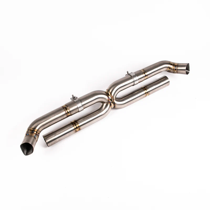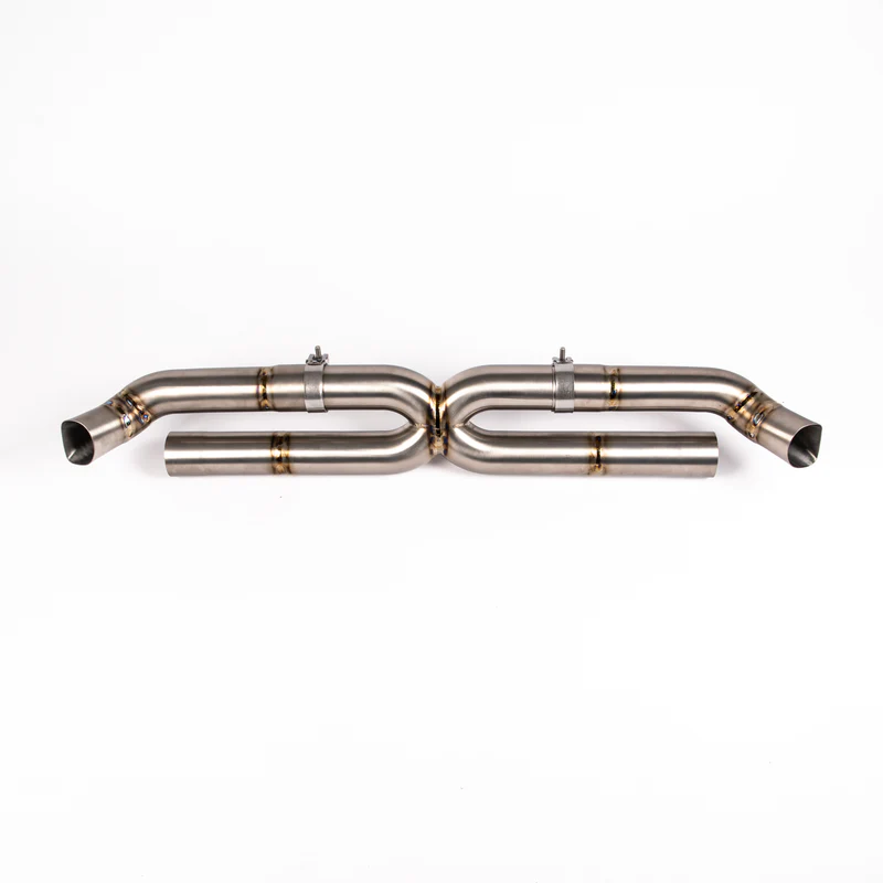 The purpose of the JCR Titanium Race Centre for the 991 GT2 RS is to reduce weight by the maximum amount possible whilst increasing flow and improving overall sound. Our race version of the centre section provides a large increase in overall sound compared to the factory centre section and includes a tuned merge for improveded exhaust scavenging effect and a smoother and more pleasant tone.